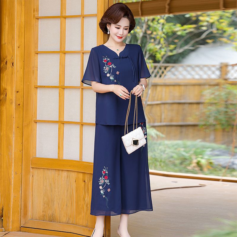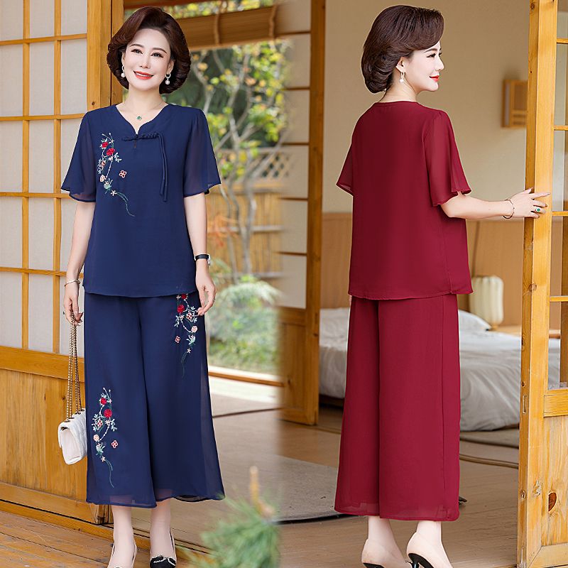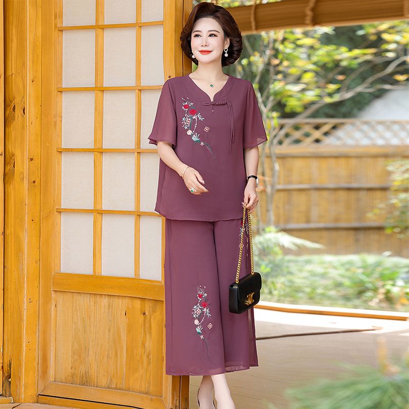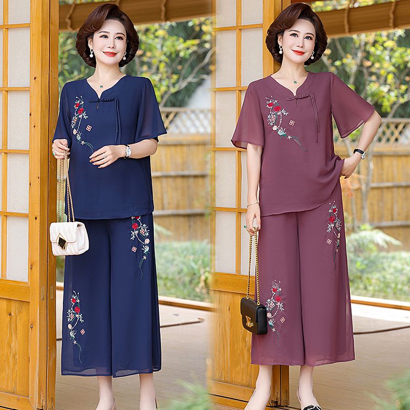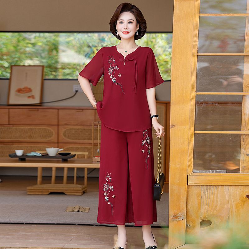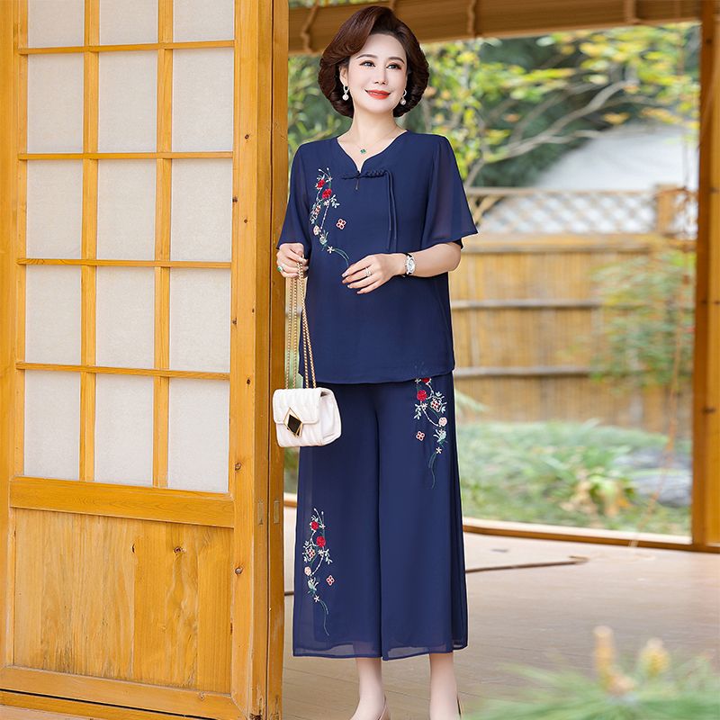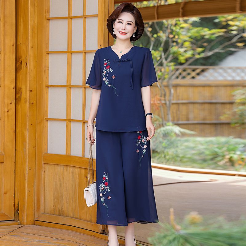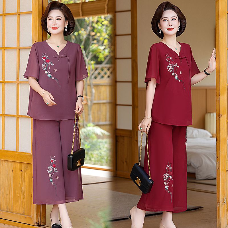 妈妈国风洋气夏季雪纺绣花短袖阔腿套装新款中老年女装时尚两件套