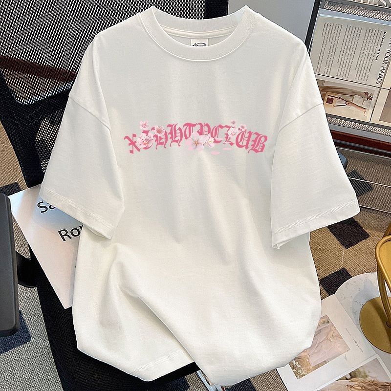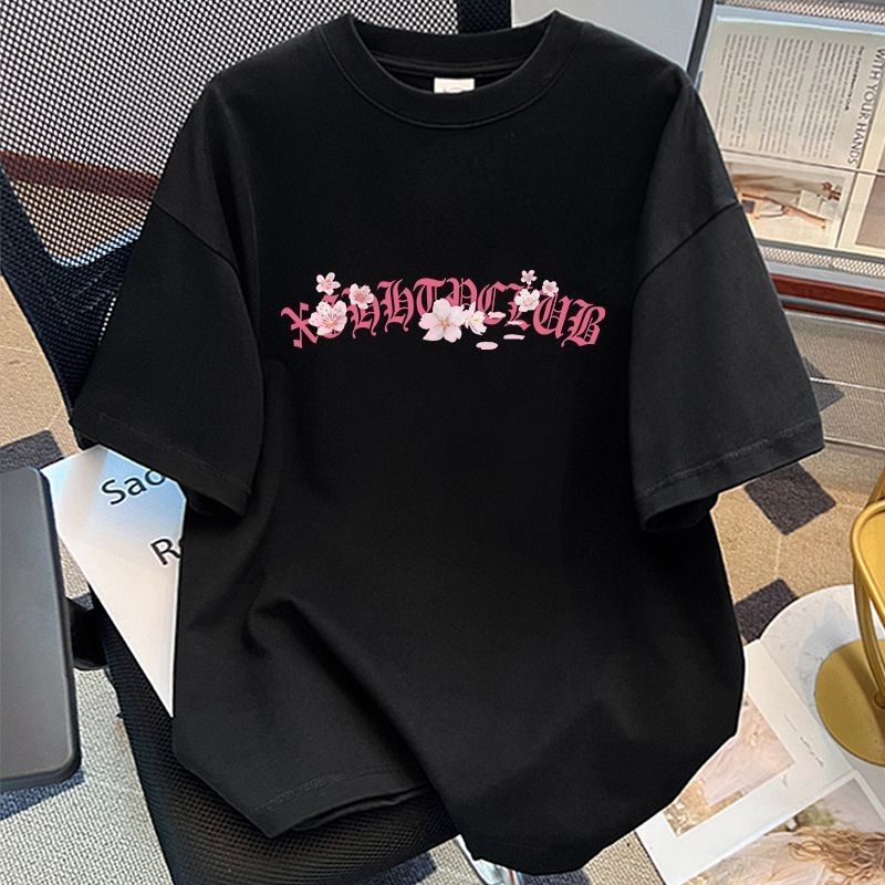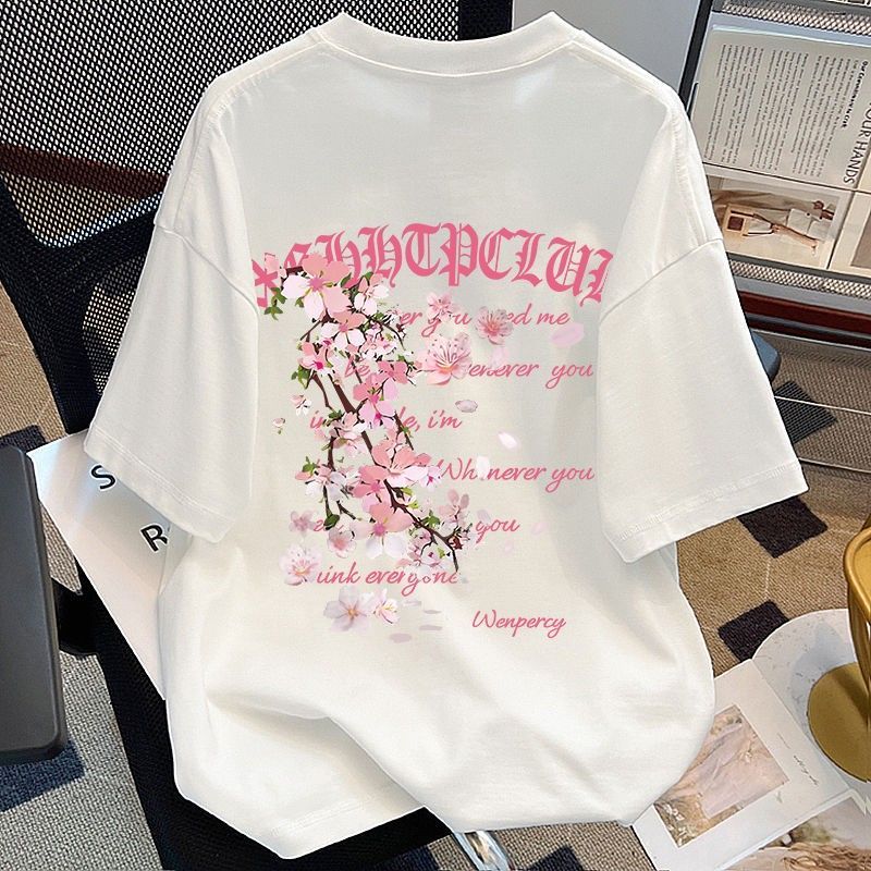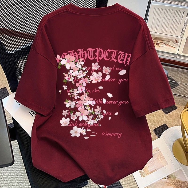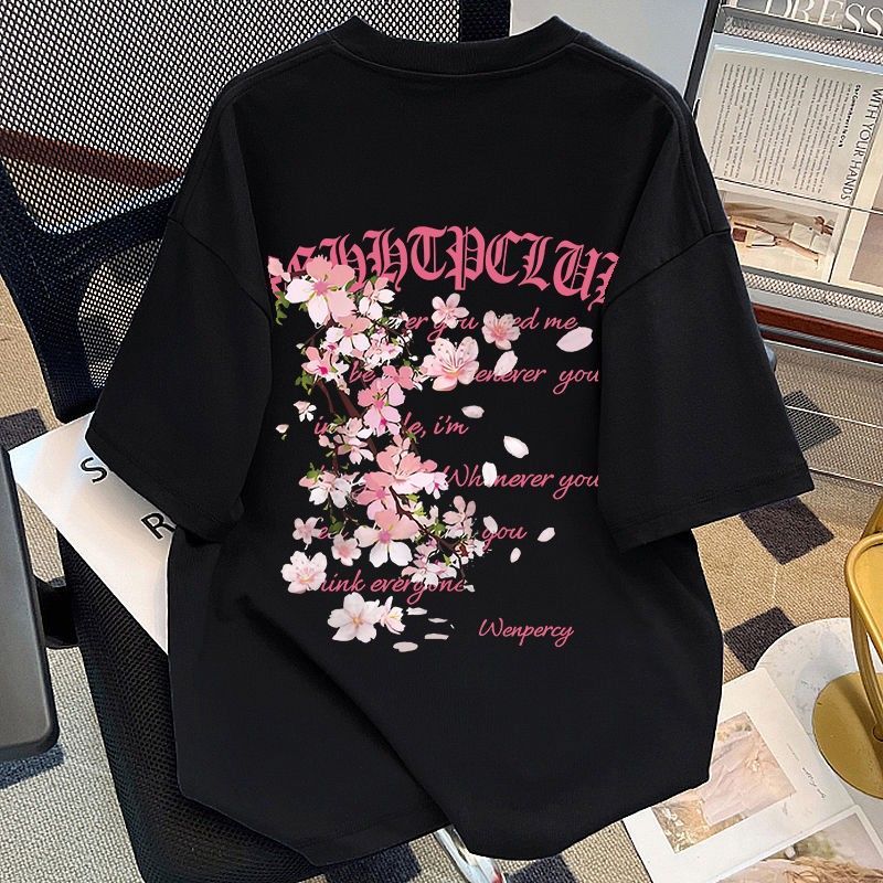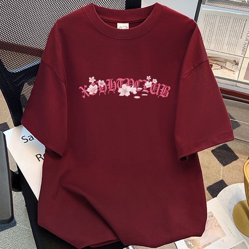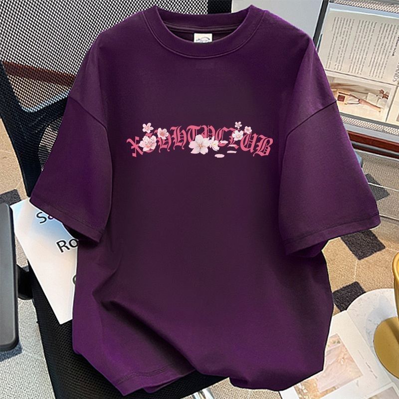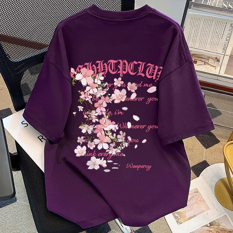 葡萄紫100%纯棉美式花卉印花短袖T恤女夏季情侣款潮牌宽松上衣ins